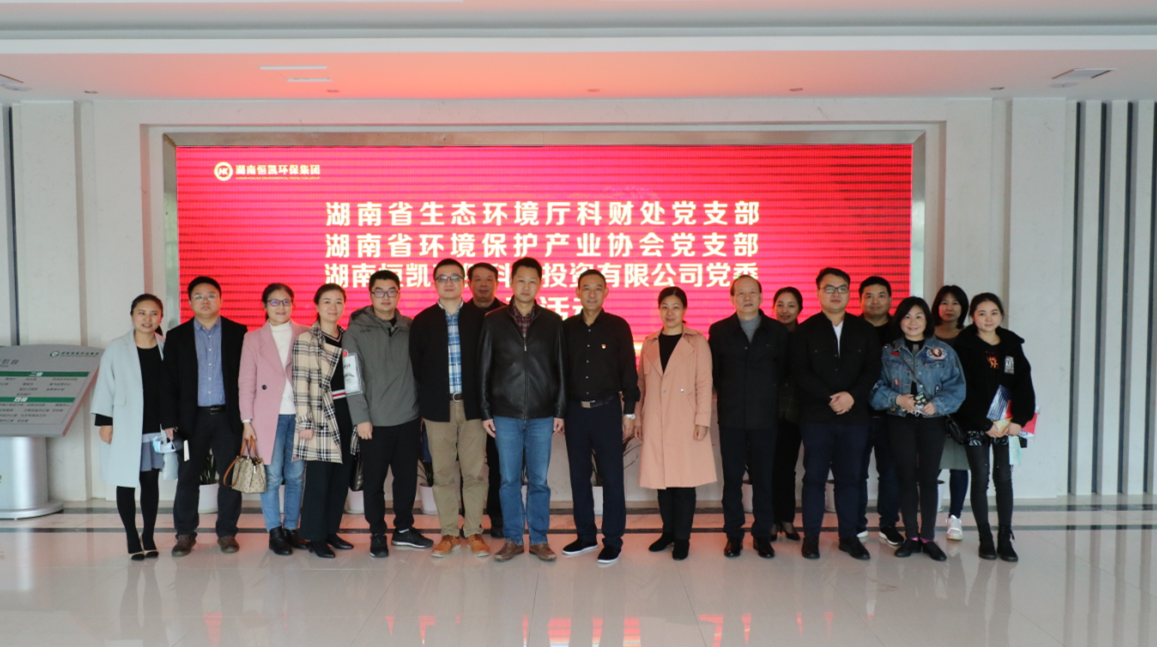4月23日下午,湖南省生态环境厅科财处党支部书记文涛和湖南省环保产业协会党支部书记柴田率支部全体党员莅临恒凯环保开展党建互联共建活动,恒凯环保党委书记、总裁王巨涛,党委副书记、副总裁何浪平,党委专职副书记郭慧及各支部党员代表参加了此次活动。