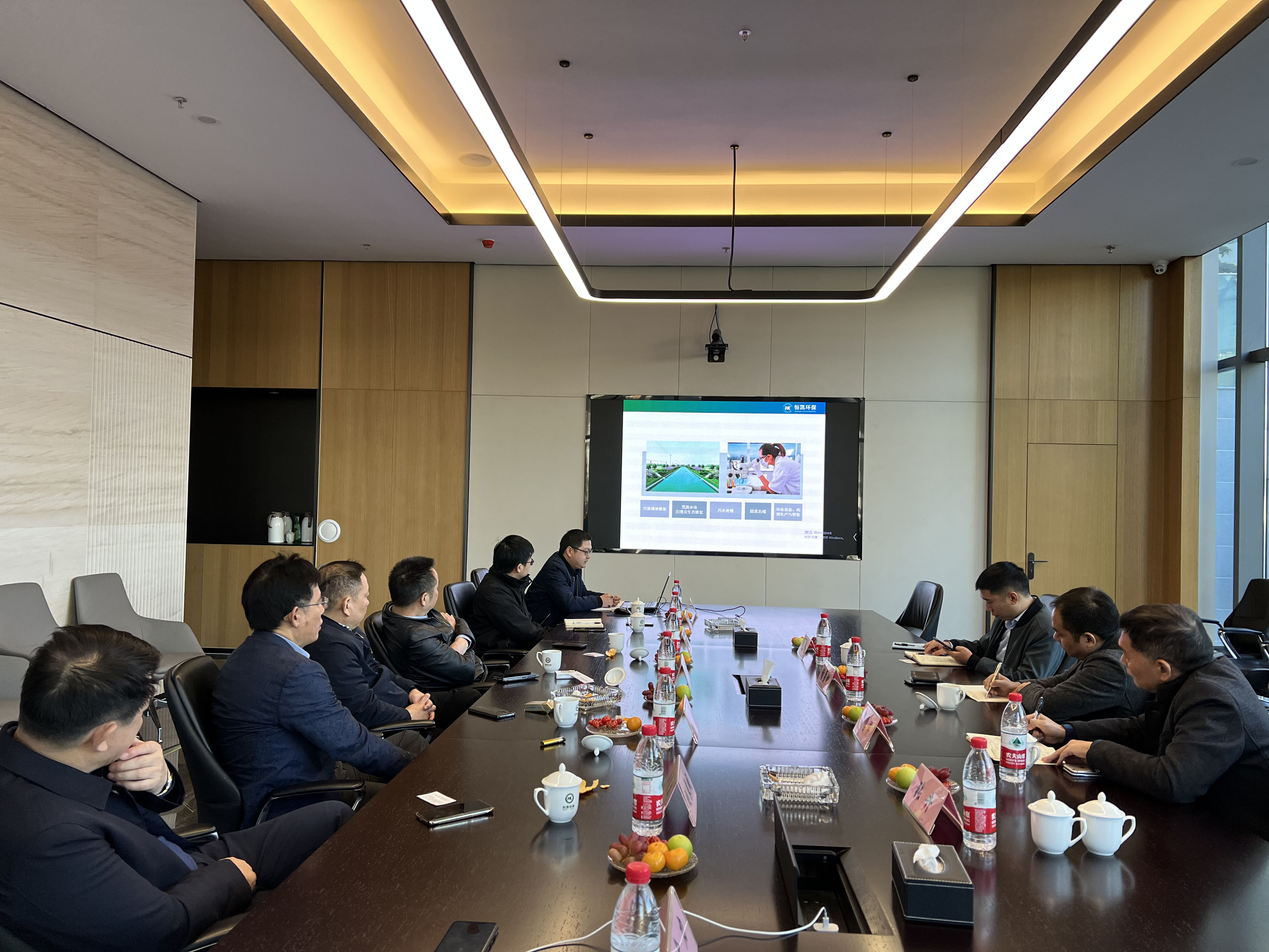 在座谈交流会上,恒凯副总裁许国生对中铁建生态环境有限公司考察团一行的莅临表示热烈欢迎,并向考察团介绍了我司的组成概况、发展领域及业务状况;恒凯技术人员对我司人居微生态板块和传统业务板块进行了详细介绍,向大家展示了我司的技术优势;随后,中铁建湖南办事处总经理谢勇彬向我司与会人员介绍了其公司的规模、业务板块及核心技术,双方就将来可能合作的环境领域的相关业务进行了深度的交流沟通。